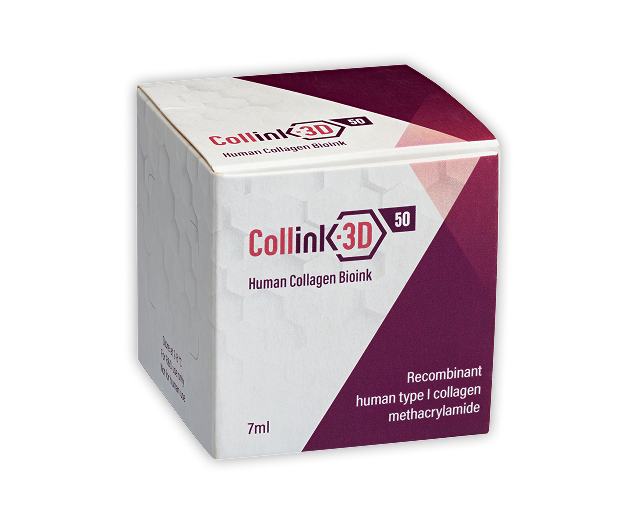 Collink.3D™ 50 is based on recombinant human type I collagen (rhCollagen), chemically modified to generate a curable bioink with approximately 50% of the primary amines converted into methacrylamides.